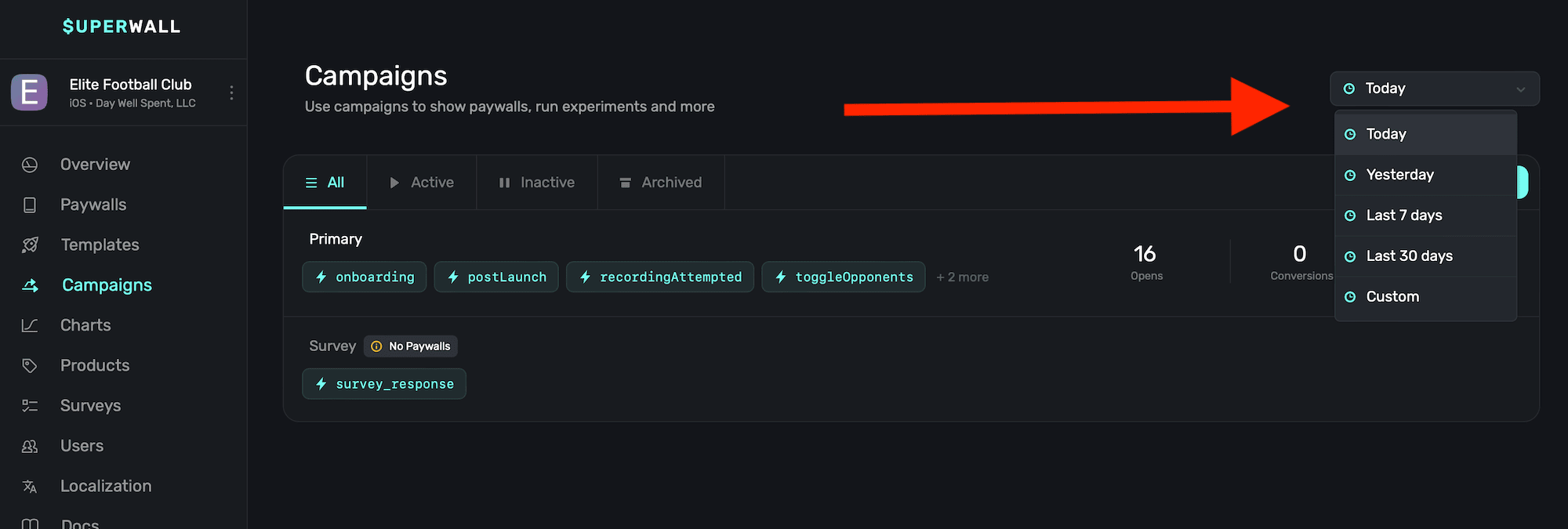 • Inactive: Campaigns that are not serving paywalls in production, but can be quickly re-enabled.