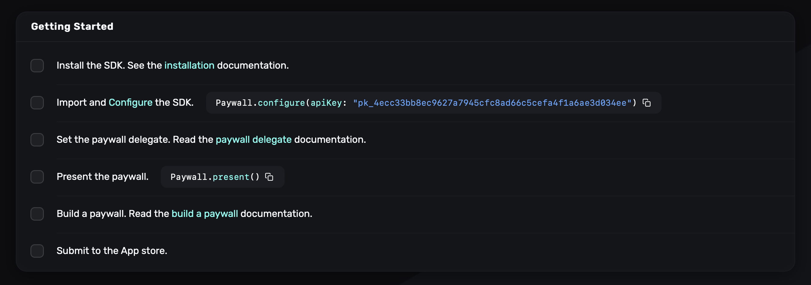 As you complete the steps to integrate Superwall these items will check off automatically. See our Quick Start guide for help.